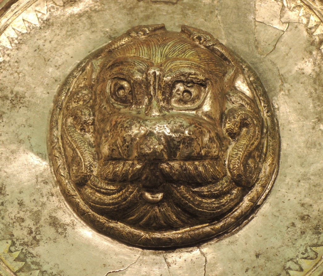 SOBRE, JUNTO Y BAJO ESTAS LÍNEAS: Arriba, mapa publicado por Jesús Rodríguez Morales y Carlos Caballero Casado, en su obra “De Miacum a Titulcia" (fig 8) -a quienes agradecemos nos permitan divulgarlo-. En él, podemos ver claramente la hipótesis de un Móstoles como posible Titulcia; junto a las distancias entre esta ciudad madrileña y Toledo, Complutum, o una Miacum en las cercanías de Galapagar. La hipótesis de Rodríguez Morales y Caballero Casado, es muy buena; aunque a mi juicio comete el error de desviarse del curso del río Guadarrama, siguiendo un camino de pastores, llamado Vereda Segoviana. Vía que seguramente fue la de trashumancia entre Segovia y las tierras del Norte de Toledo; aunque no la concibo como ruta directa hasta la capital toledana. Habida cuenta que desde Villaviciosa, se encamina fuera de las orillas del Guadarrama; un río que nos lleva directamente hasta la ciudad manchega. Al lado y abajo, dos imágenes de la famosísima pátera argéntea, dorada; que se halló en Titulcia (Bayona del Tajuña). Fechada entre el 350 y el 250 a.C.; es propiedad del Museo Regional Arqueológico de Alcalá de Henares, al que agradecemos nos permita divulgar la imagen. Representa un ser fantástico con características celtibéricas; al que denominan en ocasiones “Medusa”. Aunque a mi juicio, más bien se trataría de un régulo guerrero, representado con sus torques y coronado con sierpes.